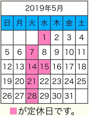 2019/04/03 5月のお休み。 5月のお休みは 毎週火曜日、第1・3水曜日となります。 ゴールデンウィークは通常営業です!! ご来店お待ちしております♪ tagPlaceholderカテゴリ: information
